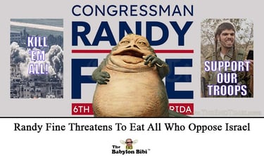 DAYTONA BEACH, FLORIDA - A jubilant, jiggling Randy Fine took to a well fortified stage at a campaign event yesterday to boast that he is personally wiling to contribute to Israel's US-supported mass genocide by eating all who oppose the mass murder of innocents for the sake of the Greater Israel Project.